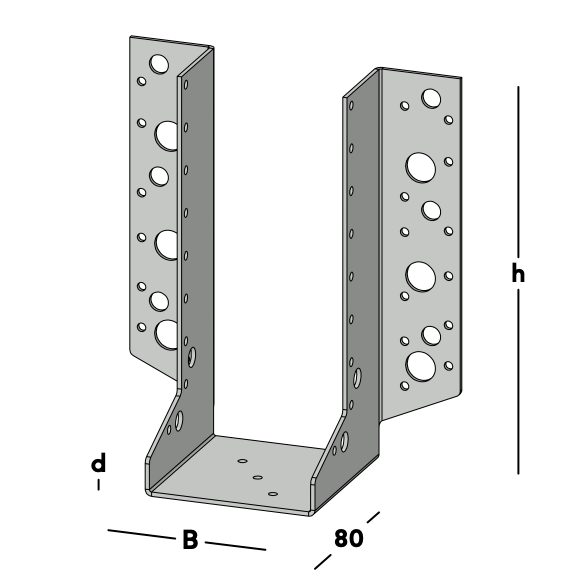 Balkdrager met zijflenzen, voor het bevestigen van dwarsbalken tegen een muur of tegen een andere houten balk. Deze balkdrager wordt ook toegepast voor het maken van ravelingen in vloeren en daken. Leverbaar voor de gangbare kopmaten van zowel geschaafd als ongeschaafd hout.