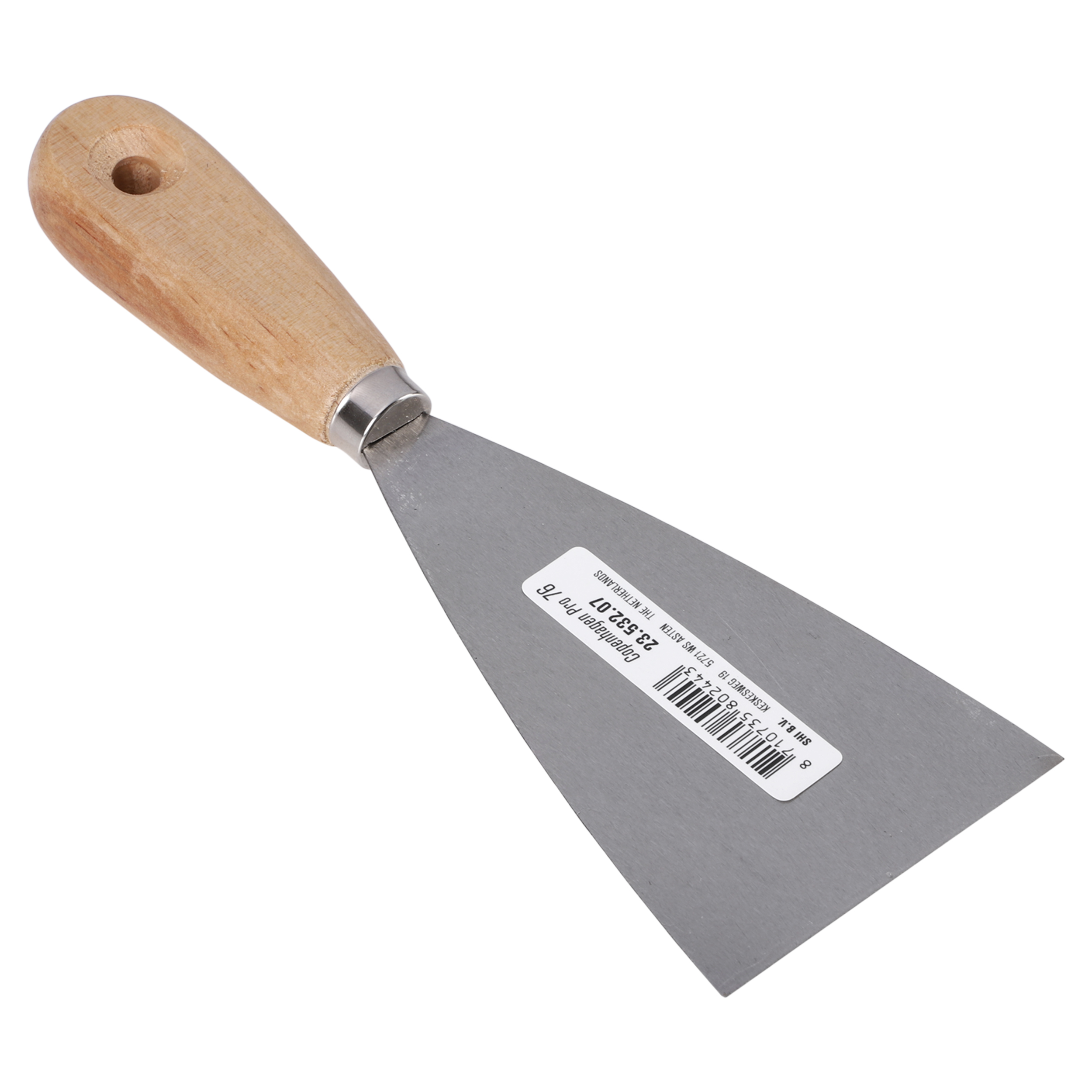 Plamuurmes voor eenvoudige werkzaamheden, voorzien van houten handvat. Te gebruiken voor muurvullers.